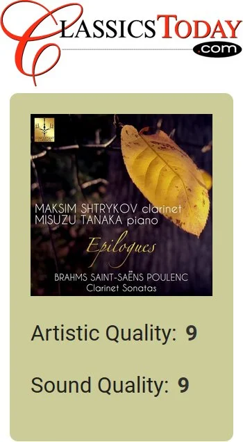 The title “Epilogues” refers to the fact that Brahms, Saint-Saëns, and Poulenc wrote clarinet sonatas at the end of their composing careers. More importantly, clarinetist Maksim Shtrykov and pianist Misuzu Tanaka serve up world-class performances of these works that yield nothing to competing catalog versions.